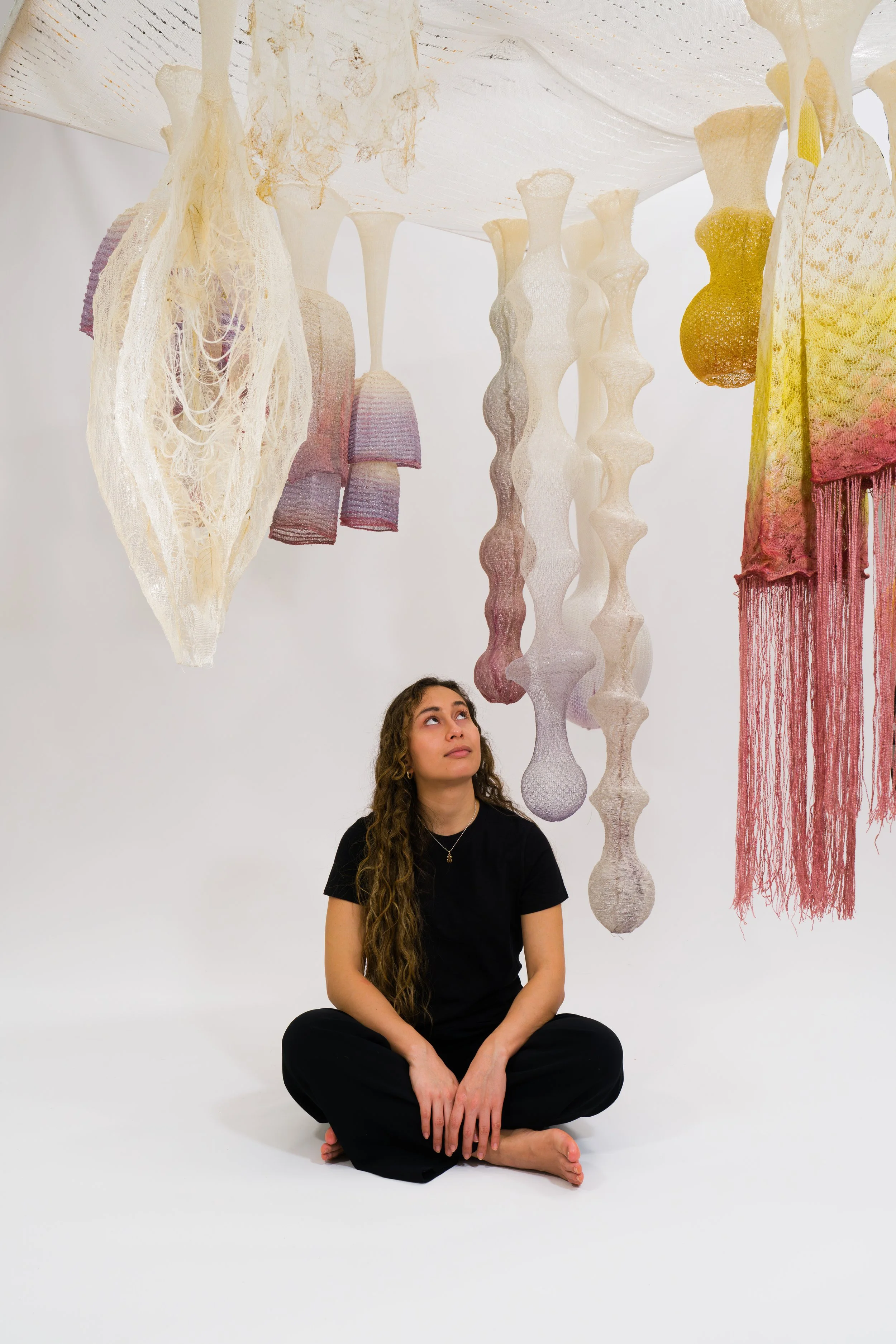 In my practice, I strive to translate these observations into tangible forms, employing a variety of mediums and techniques to bring my vision to life. One of my primary mediums is knitting. I use the knitting machine and natural fibers like silk, wool, and cotton to create intricate patterns and textures reminiscent of natural phenomena. For example, I might draw upon the delicate symmetry of a mushroom to inform the intricate lacework of a knitted piece. In addition to knitting, I am deeply intrigued by the potential of biomaterials, such as fungi dye and bioplastics, to revolutionize sustainable practices. By cultivating fungi in controlled environments, I can harness their natural pigment-producing properties to create vibrant, unique prints for my textiles.