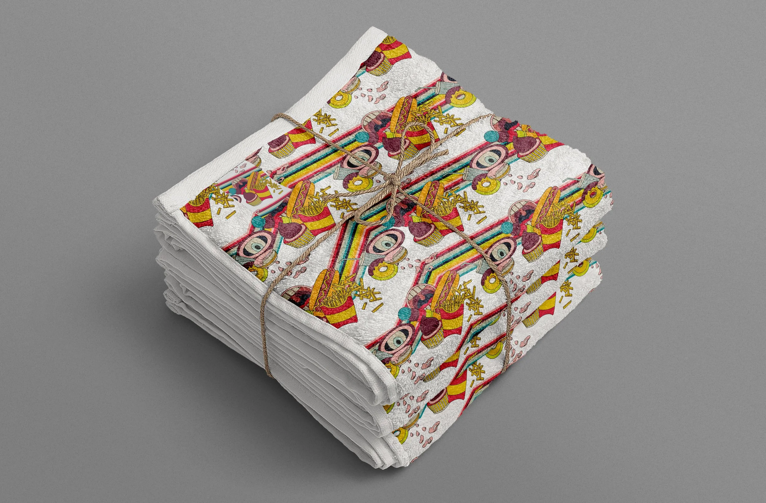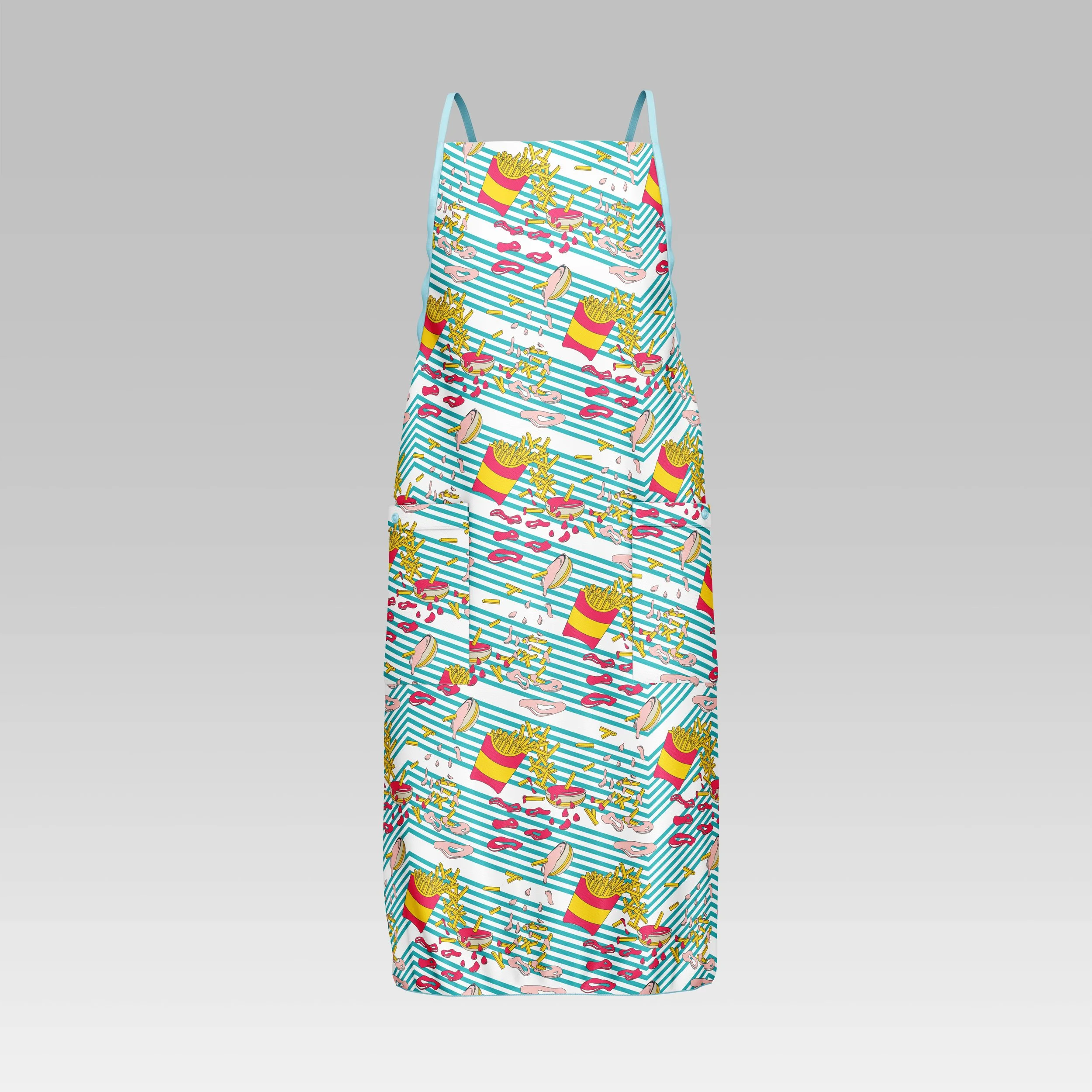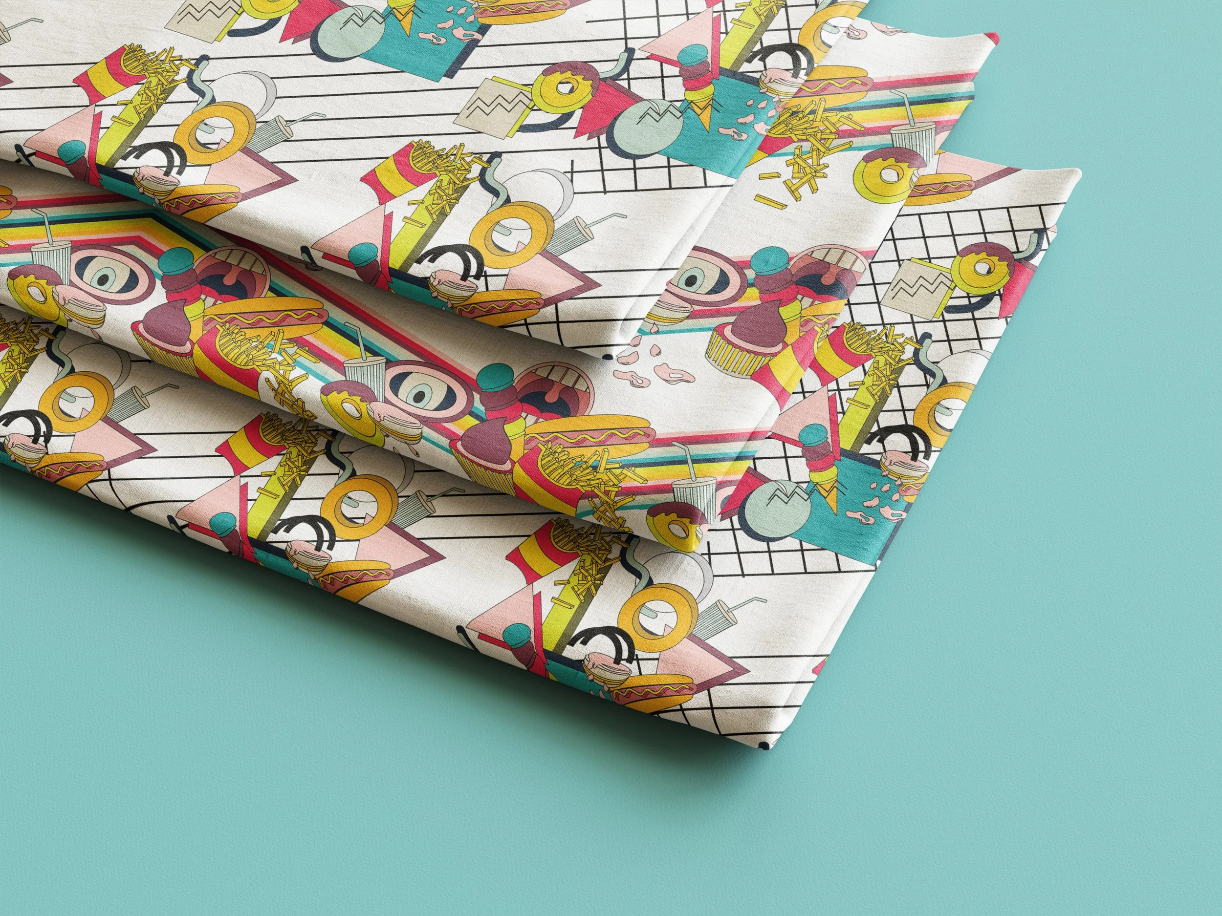 This print is inspired by Fabiola, the gluttonous aunt—a joyful, larger-than-life character who embraces indulgence with zero hesitation and plenty of humor. Drawing from her unapologetic love of French fries, donuts, and all things drizzled in ketchup, the design channels a bold pop-art energy: vibrant colors, playful shapes, and a nostalgic wink at vintage food ads. Created for kitchen textiles like napkins, mittens, and aprons, the print celebrates the fun, chaotic, delicious side of home cooking—turning everyday kitchen moments into a feast of personality and color.