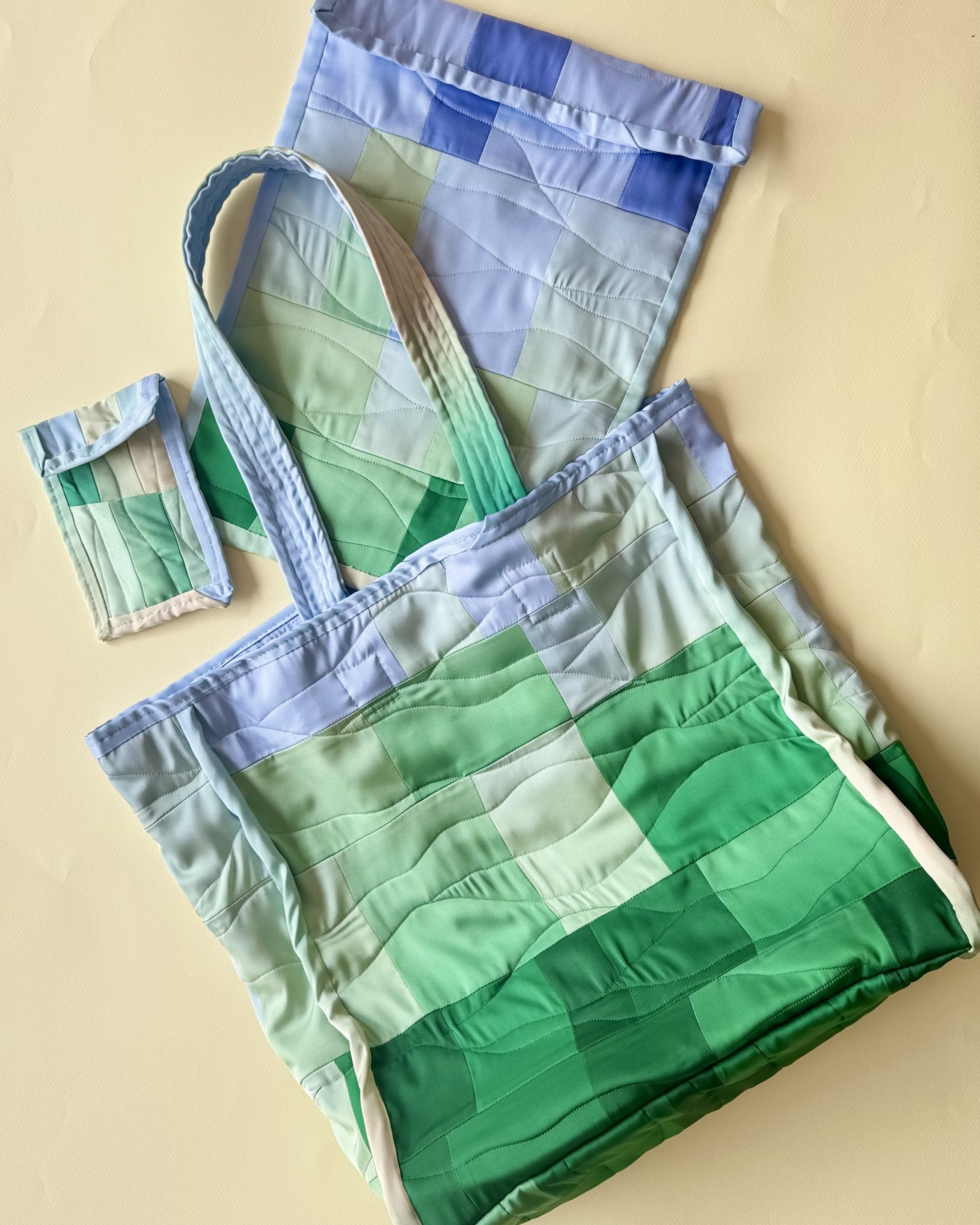 This project was born to remind us of the essential: to reconnect with what surrounds us. Scraps of fabric that were once discarded are transformed into bags that tell stories. Stories of sky and earth, of seams that follow the shape of the mountains, of colors that transition from green to blue like the landscape they inspire.